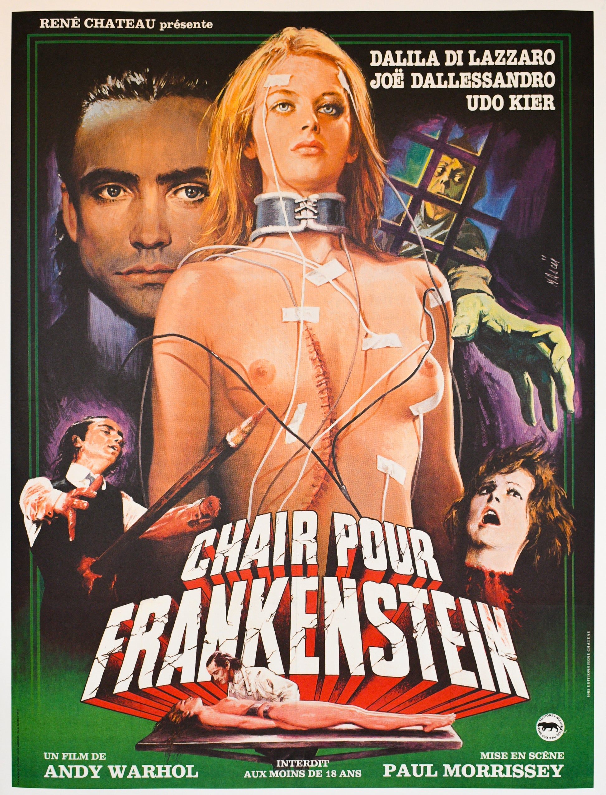 This Poster printed in 1973 promotes the theatrical run of the film in France. Paul Morrissey and Antonio Margheriti directed this Andy Warhol Produced film where Udo Kier attempts to create a master race of humans from a male and female "zombie".
