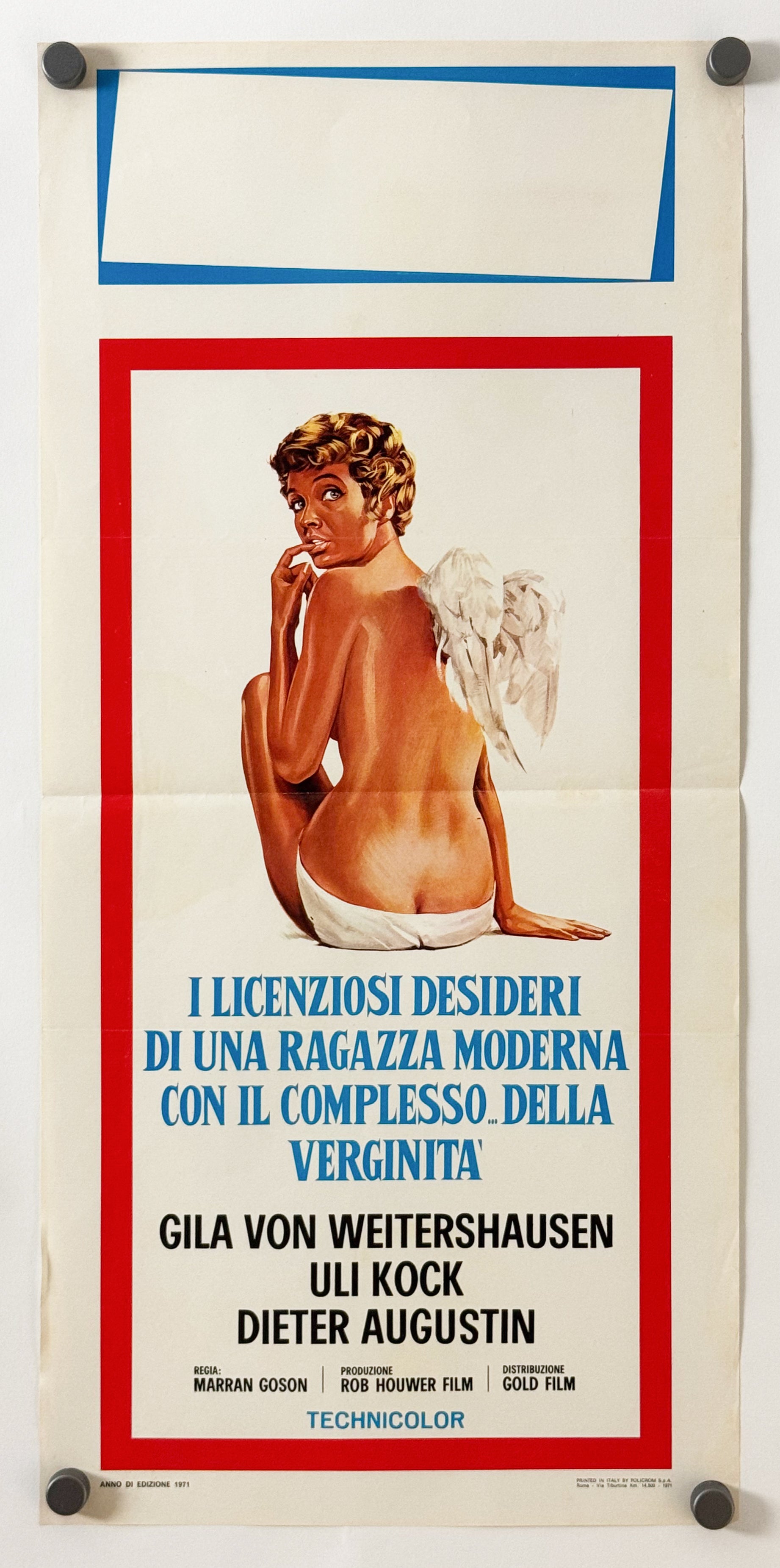 This original poster was printed in 1968. The poster was made to promote the movie “I licenziosi desideri di una ragazza moderna con il complesso... della verginità” (The Licentious Desires of a Modern Girl with a Virginity Complex). The movie was directed by Marran Gosov and stars Gila von Weitershausen.