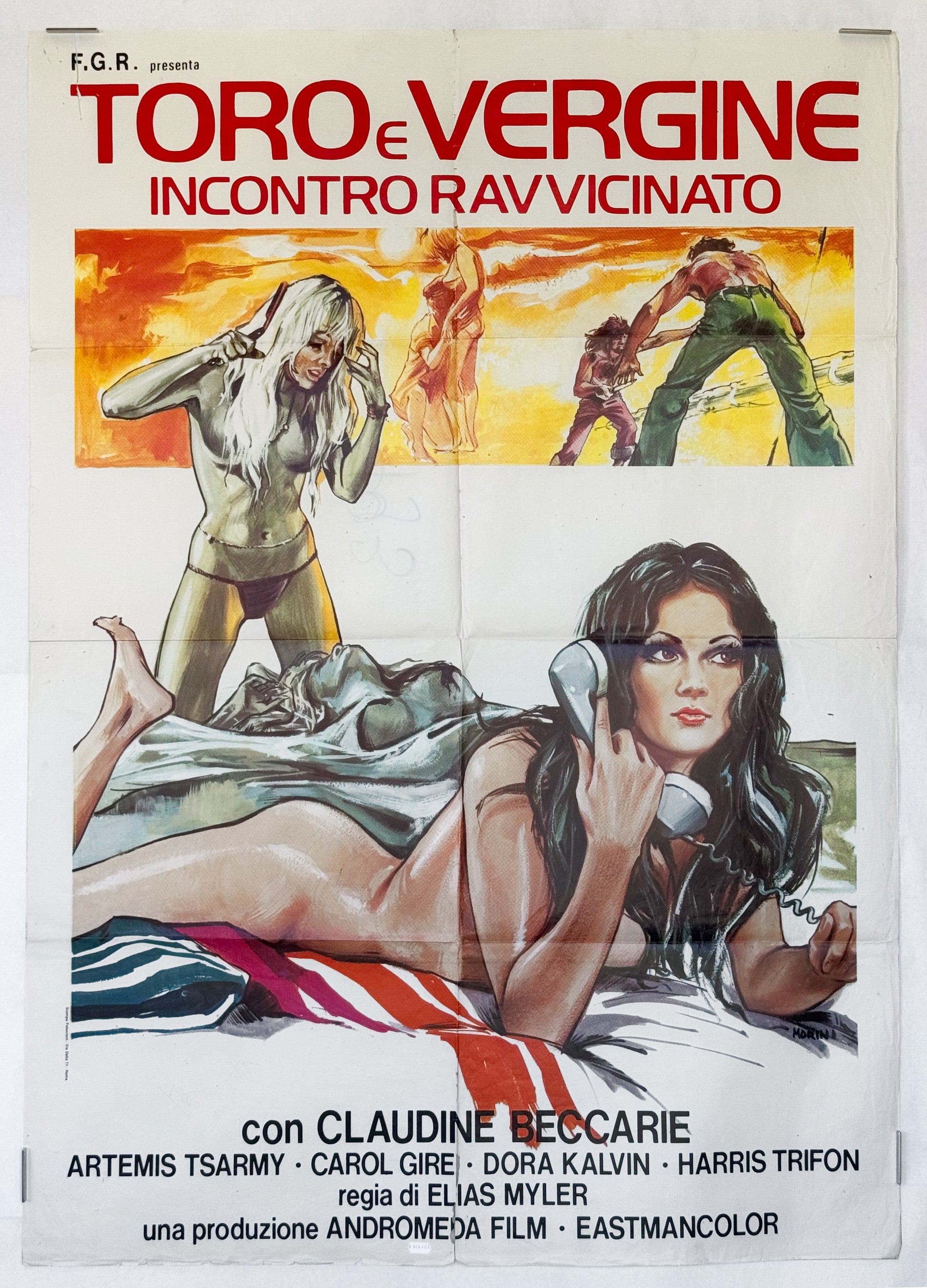 This 1977 original poster was printed to promote the movie “Toro e Vergine Incontro Ravvicinato” (Taurus and Virgo Close Encounter). The film stars Claudine Beccarie, Artemis Tsarmy, Carol Gire, Dora Kalvin, and Harris Trifon.