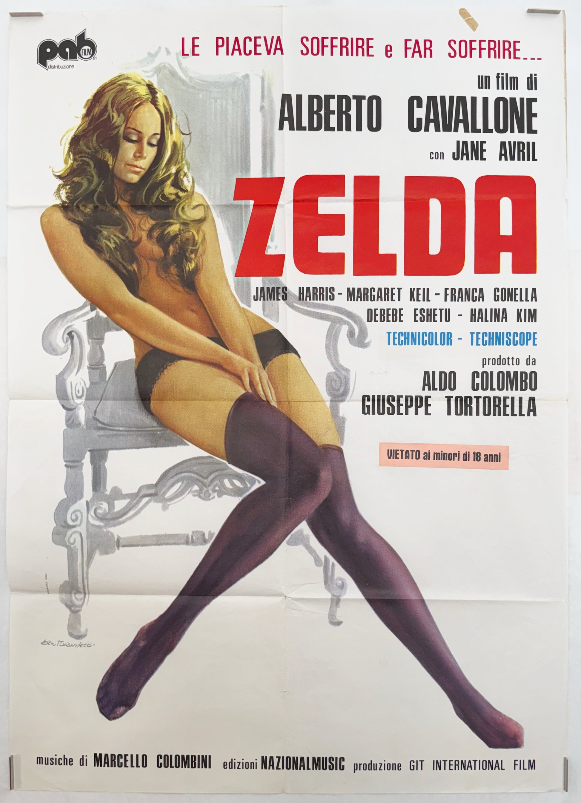 This poster was printed in 1974. The poster promoted the sexploitation movie “Zelda,” directed by Alberto Cavallone featuring Jane Avril and James Harris.